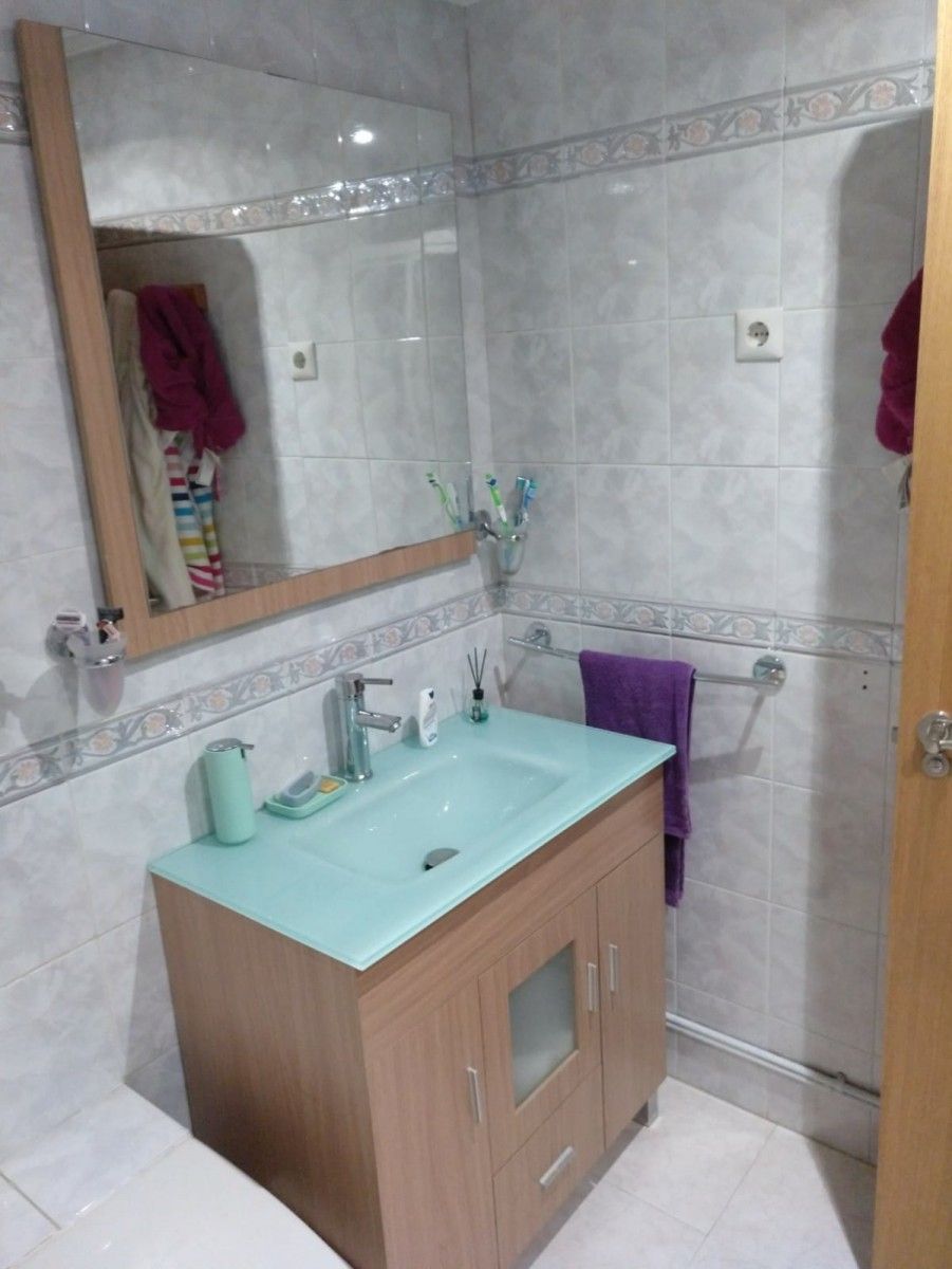 Bainugelari dagokionez, banaketa berri bat proposatu genuen. Bainuontzia, dutxa batengatik ordezkatu genuen eta konketako armairuaz gain, 90cm-ko armairu handi bat diseinatu genuen. Bertan, arropa, eskuoihalak, garbiketa produktuak…gordetzeko espazio anitz ezarriz. Diseinuari dagokionez, beige eta gris koloreko bi baldosa ezberdin hautatu genituen, haritzezko armairuekin konbinatuz eta berotasun ukitua eskainiz.