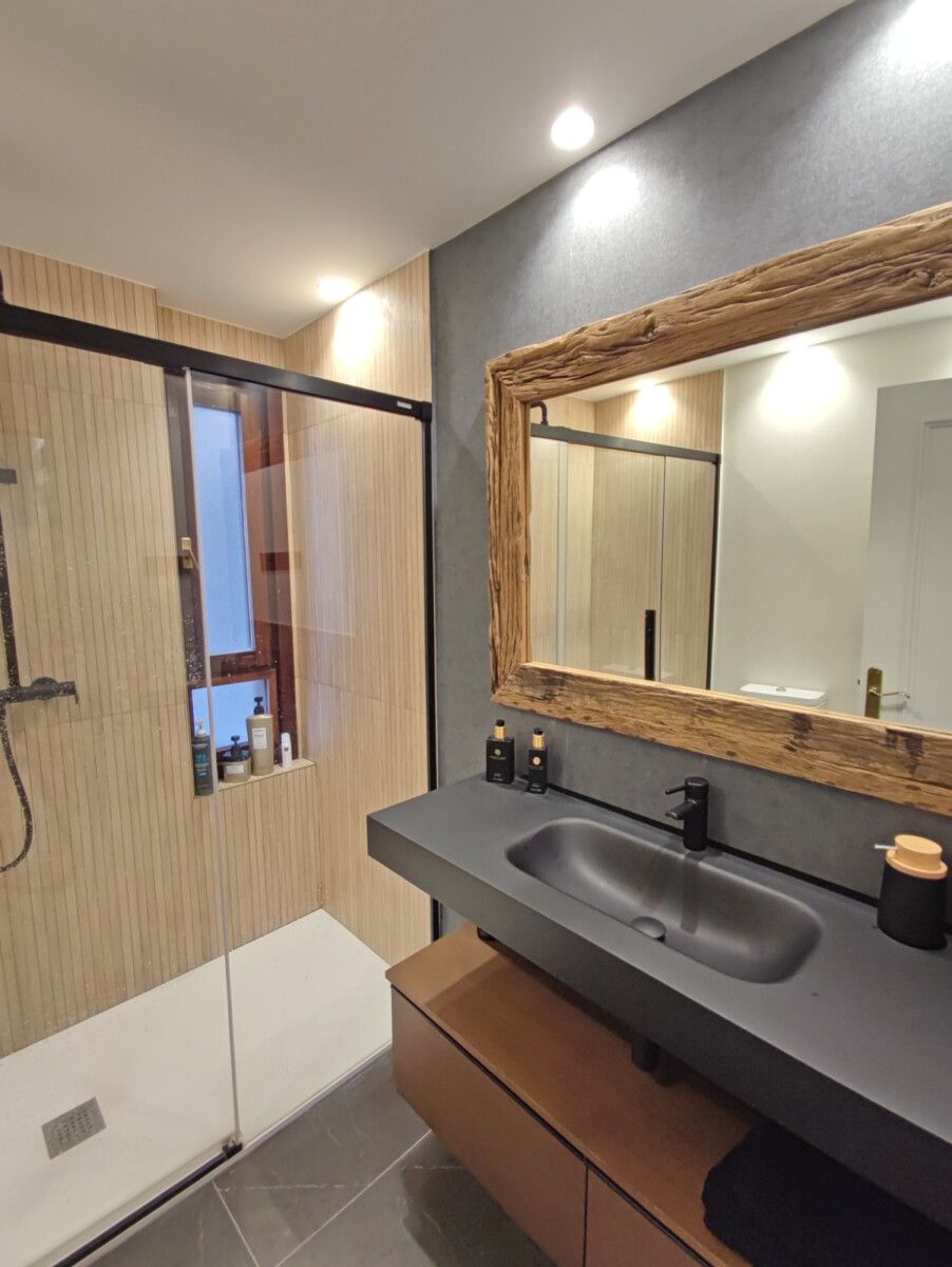 Por otro lado, realizamos la reforma integral de los baños y el aseo. Escogimos mobiliario a medida y azulejos que daban un toque de distinción a los espacios. También sustituimos en su totalidad la fontanería con accesorios de Ramón Soler y la electricidad con mecanismos Zenit Nissen negro mate.